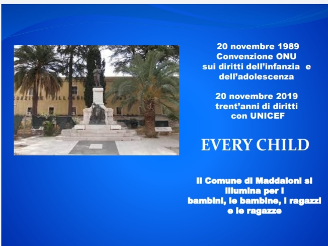 Per i trent'anni della Convenzione ONU sui diritti dell'infanzia e dell'adolescenza, a Maddaloni è stato illuminato il Monumento dei Caduti di Piazza Vittoria di colore blu.