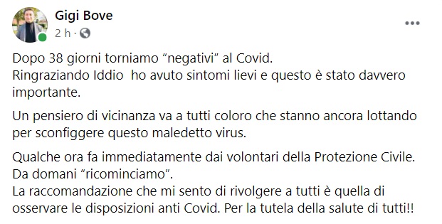 "Dopo 38 giorni torniamo “negativi” al Covid. Ringraziando Iddio ho avuto sintomi lievi e questo è stato davvero importante. Un pensiero di vicinanza va a tutti coloro che stanno ancora lottando per sconfiggere questo maledetto virus. -Si legge nella nota- Qualche ora fa immediatamente dai volontari della Protezione Civile. Da domani “ricominciamo”. La raccomandazione che mi sento di rivolgere a tutti è quella di osservare le disposizioni anti Covid. Per la tutela della salute di tutti!!"