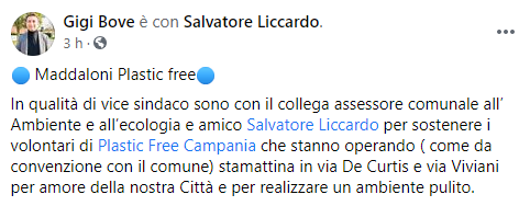 Questo il post pubblicato dal Vicesindaco di Maddaloni Gigi Bove: "Maddaloni Plastic free. In qualità di vice sindaco sono con il collega assessore comunale all’ Ambiente e all’ecologia e amico Salvatore Liccardo per sostenere i volontari di Plastic Free Campania che stanno operando (come da convenzione con il comune) stamattina in via De Curtis e via Viviani per amore della nostra Città e per realizzare un ambiente pulito".