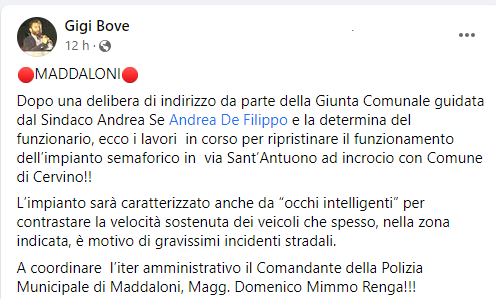 Questo il post pubblicato sulla sua pagina Facebook dal Sindaco di Maddaloni Andrea De Filippo: "Dopo una delibera di indirizzo da parte della Giunta Comunale guidata dal Sindaco Andrea De Filippo e la determina del funzionario, ecco i lavori in corso per ripristinare il funzionamento dell’impianto semaforico - si legge nel post - in via Sant’Antuono ad incrocio con Comune di Cervino!! L’impianto sarà caratterizzato anche da “occhi intelligenti” per contrastare la velocità sostenuta dei veicoli che spesso, nella zona indicata, è motivo di gravissimi incidenti stradali. A coordinare l’iter amministrativo - conclude il post - il Comandante della Polizia Municipale di Maddaloni, Magg. Domenico Mimmo Renga!!!".
