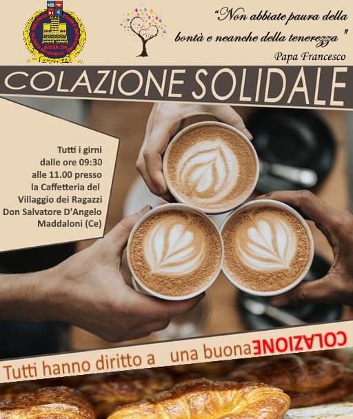 "Da Lunedì 10 Febbraio 2020, dalle ore 9.30 alle ore 11.00, caffè, cappuccino e cornetto per chi non può permetterselo alla Caffetteria-Laboratorio del “Villaggio dei Ragazzi”, sita all’interno dello storico edificio di Piazza Matteotti. Tutto con l’aiuto e il contributo di associazioni senza scopo di lucro. Si legge nel comunicato. L’obiettivo di questo gesto simbolico è quello di essere solidale con persone che non riescono più a fare fronte ai bisogni primari: un tetto, un posto caldo, e cosi via. Ad oggi, ha aderito al progetto, che si protrarrà dal Lunedì al Venerdì fino alla fine dell’anno scolastico, l’Associazione di Promozione Sociale: “L’Albero della Vita”. Si legge nel comunicato. “È una iniziativa filantropica e solidale che si concretizza in un piccolo gesto quotidiano di grande valore per gli indigenti. La solidarietà, d’altra parte, è nel dna del “Villaggio dei Ragazzi”, ha dichiarato Giovanna D’Onofrio, Coordinatrice didattica delle Scuole Superiori dell’Opera maddalonese e promotrice dell’evento solidale."