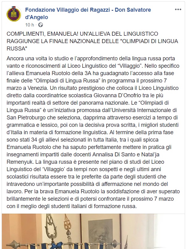 Emanuela Ruotolo, studentessa del Liceo Linguistico della Fondazione Villaggio dei Ragazzi di Maddaloni, si è qualificata per le Olimpiadi di Lingua Russa.