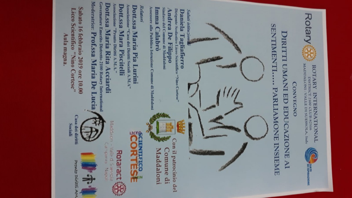 Presso il Liceo Scientifico "Nino Cortese" di Maddaloni si sta svolgendo il convegno dal titolo "Diritti umani ed educazione ai sentimenti... parliamone insieme". Saluti istituzionali del dirigente scolastico Daniela Tagliafierro e del Sindaco di Maddaloni Andrea De Filippo, tra i relatori le dottoresse Maria Pia Lurini, Mara Piscitelli Maria Rita Acciardi. Assente per motivi influenzali l'assessore alla Pubblica Istruzione Imma Calabrò.