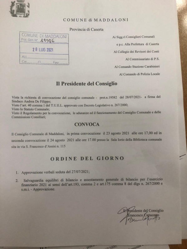 Martedì in diretta streaming sui nostri canali il Consiglio comunale di Maddaloni. All'ordine del giorno la 'Salvaguardia degli equilibri di bilancio e assestamento generale di bilancio per l'esercizio finanziario 2021 ai sensi dell'art. 193 comma 2 e art. 175 comma 8 del dlgs. n. 267/2000 e s.m.i. Approvazione". Di seguito la lettera di convocazione.