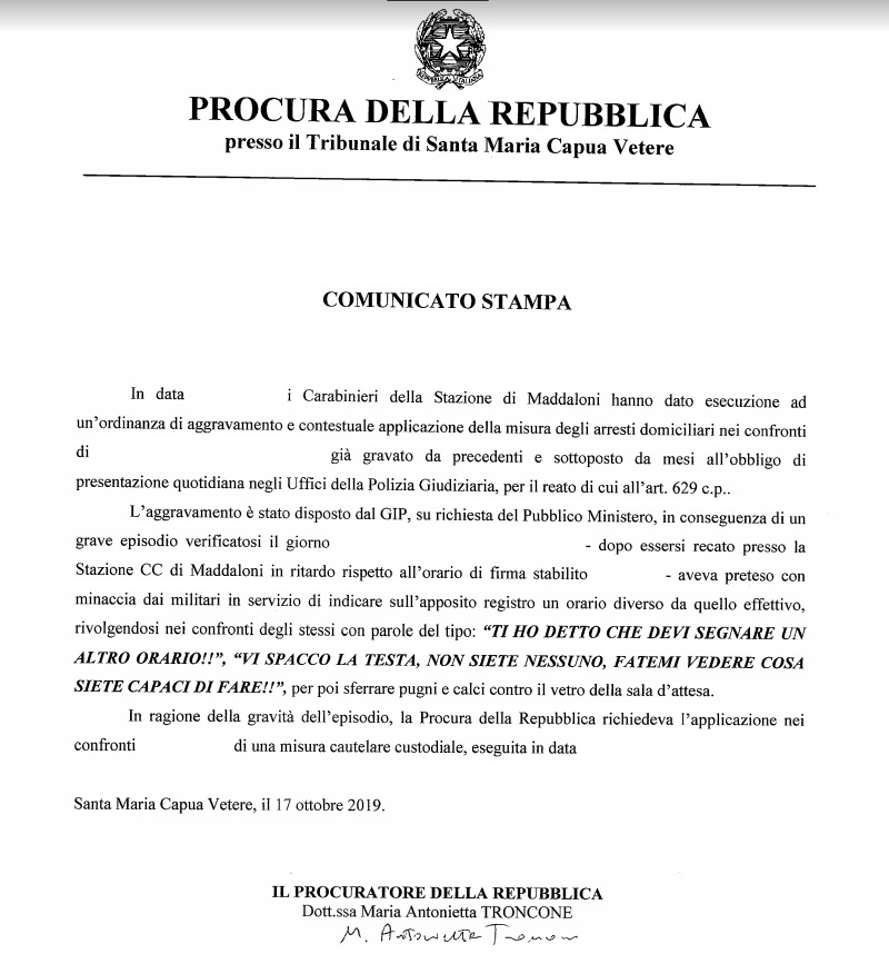 Questa la nota del Comando Provinciale Carabinieri di Caserta: