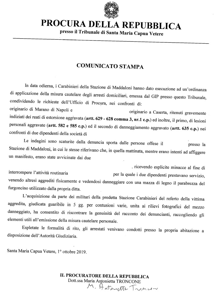 Questo parte del comunicato stampa della Procura della Repubblica di SMCV: