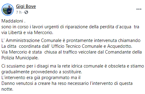 Questo il post pubblicato sulla sua pagina Facebook dal Vicesindaco di Maddaloni Luigi Bove: "Maddaloni. Sono in corso i lavori urgenti di riparazione della perdita d’acqua tra via Libertà e via Mercorio. L’ Amministrazione Comunale - si legge nel post - è prontamente intervenuta chiamando La ditta coordinata dall’ Ufficio Tecnico Comunale e Acquedotto. Via Mercorio è stata chiusa al traffico veicolare dal Comandante della Polizia Municipale. Ci scusiamo per i disagi - prosegue il post - ma la rete idrica comunale è obsoleta e stiamo gradualmente provvedendo a sostituire. L’intervento era già programmato ma il danno venutosi a creare ha reso necessario l’intervento di questa notte".