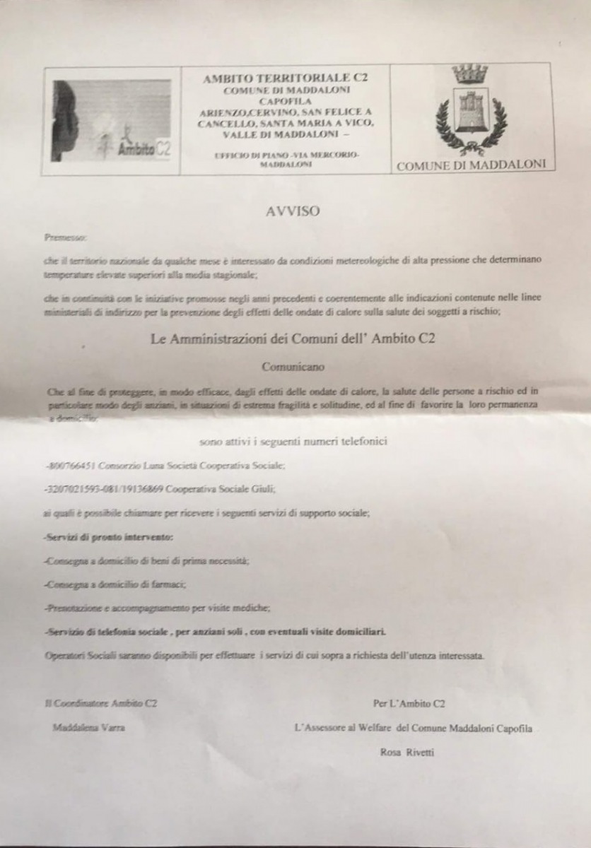 Avviso. Premesso che il territorio nazionale da qualche mese è interessato da condizioni meteorologiche di alta pressione che determinano temperature elevate superiori alla media stagionale; che in continuità con le iniziative promosse negli anni precedenti e coerentemente alle indicazioni contenute nelle linee ministeriali di indirizzo per la prevenzione degli effetti delle ondate di calore sulla salute dei soggetti a rischio; le amminastrazioni dei comuni dell'Ambito C2 comunicano che al fine di proteggere, in modo efficace, dagli effetti delle ondate di calore, la salute delle persone a rischio ed in particolare modo gli anziani, in situazioni di estrema fragilità e solitudine e al fine di favorire la loro permanenza a domicilio: sono attivi i seguenti numeri telefonici: 800766451 Consorzio Luna Società Cooperativa Sociale; 3207021593-081/19136869 Cooperativa Sociale Giuli; ai quali è possibile chiamare per ricevere i seguenti servizi di supporto sociale;
