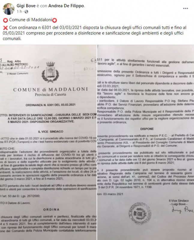 "Comune di Maddaloni. Con ordinanza n 6301 del 03/03/2021 disposta la chiusura degli uffici comunali tutti e fino al 05/03/2021 compreso- si legge nella nota- per procedere a disinfezione e sanificazione degli ambienti e degli uffici comunali."
