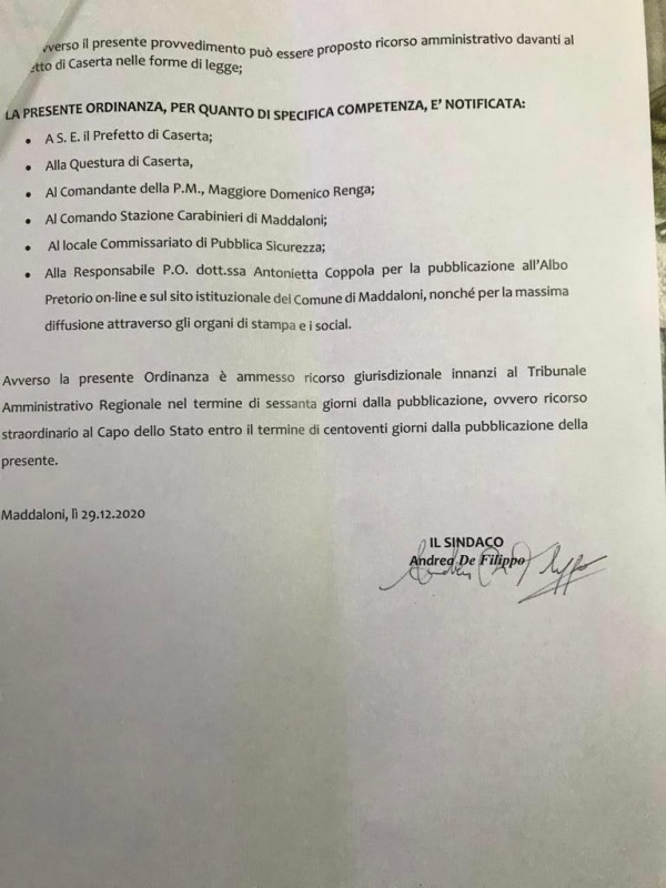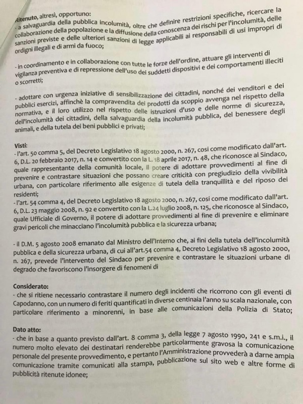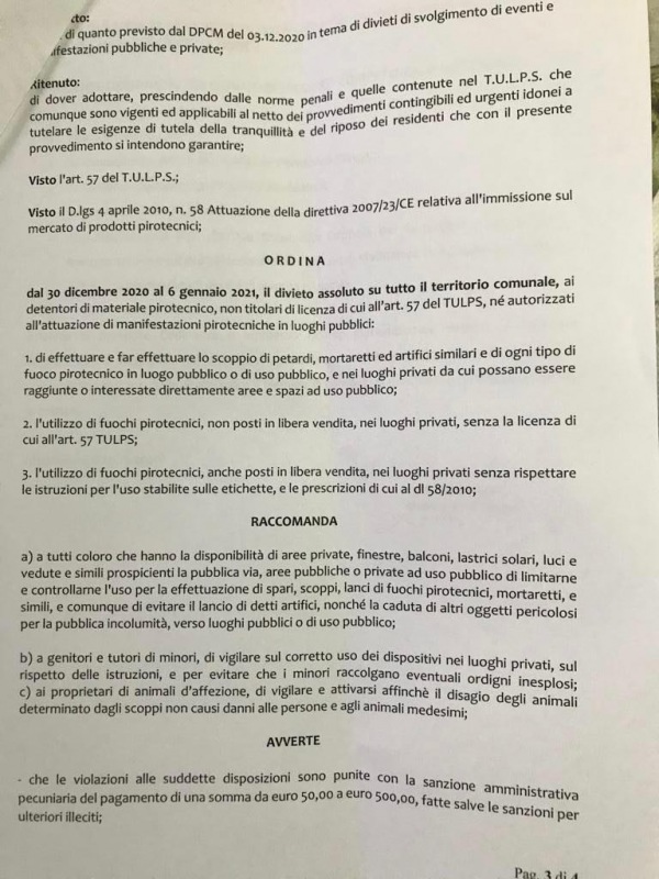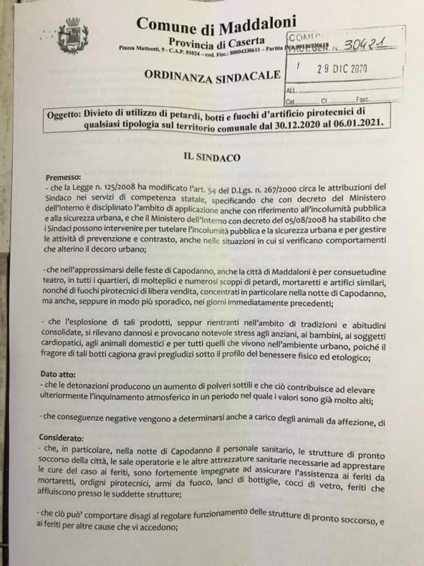 Pubblichiamo ordinanza del Sindaco di Maddaloni sul divieto utilizzo fuochi pirotecnici