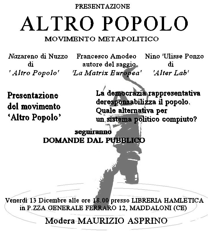 Pubblichiamo nota stampa di Altro Popolo: "Si svolgerà venerdì 13 dicembre alle ore 18, presso la libreria ‘Hamletica’ in piazza Gen. Ferraro 12, il convegno di presentazione del movimento metapolitico ‘Altro Popolo’. Si tratta di una nuova realtà politica e culturale che si prefigge l’obiettivo di incidere nella società attuale - si legge nella nota -, segnata da una cultura basata dall’assenza di valori positivi per l’uomo e dalla ‘cultura del godimento’ perseguita in tutti gli aspetti della nostra contemporaneità, proponendo un modello nuovo basato sullo sviluppo di una coscienza critica e costruttiva ed agendo direttamente nella società. Questo compito spetta alla politica ed è per questo che per noi è essenziale l’impegno pubblico. Per farlo abbiamo stilato anche un programma che propone un modello diverso di Stato - si legge nella nota -, inteso non come semplice e riduttiva denominazione istituzionale, ma come essenza ideale a cui tutti i cittadini devono indirizzare le proprie azioni. Ad aprire l’incontro sarà l’intervento di Nazareno Di Nuzzo, componente del nascente movimento, che illustrerà ai presenti il percorso che ha portato alla fondazione e le finalità perseguite. Successivamente - si legge nella nota - prenderanno la parola Francesco Amodeo, autore del saggio ‘La Matrix Europea’, e Nino ‘Ulisse’ Ponzo del laboratorio politico ‘AlterLab’. A moderare l’incontro sarà Maurizio Asprino di ‘Altro Popolo’. Oltre alla presentazione del movimento, gli interventi muoveranno su due tematiche di fondo: ‘La democrazia rappresentativa deresponsabilizza il popolo’ e ‘Quale alternativa per un sistema politico compiuto’. A chiudere il convegno - si legge nella nota - saranno le consuete domande dal pubblico. Per gli aggiornamenti si prega di seguire la pagina Facebook ed l’evento social dedicato".
