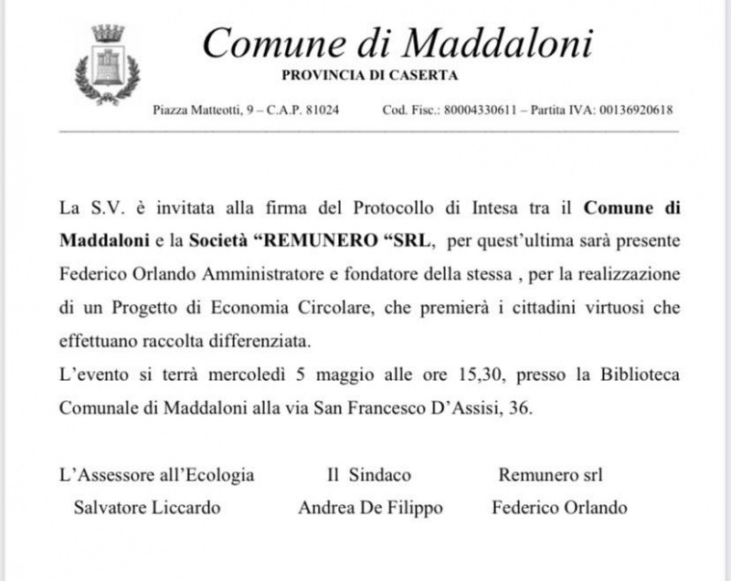 Mercoledì 5 maggio alle ore 15:30, presso la Biblioteca comunale di Maddaloni e in diretta sulla nostra pagina facebook Gold WebTv, vi sarà la firma del Protocollo di Intesa tra il Comune di Maddaloni e la società Remunero in merito ad un progetto di economia circolare inerente alla raccolta differenziata. Questo progetto prevede che i cittadini più virtuosi nell'effettuare la raccolta differenziata siano infatti premiati. L'evento, che ripetiamo, sarà trasmesso in diretta sulla nostra pagina facebook Gold WebTv, sarà presenziato dal Sindaco Andrea De Filippo, dall'Ass. all'Ecologia Salvatore Liccardo e dell'AD di Remunero Federico Orlando.