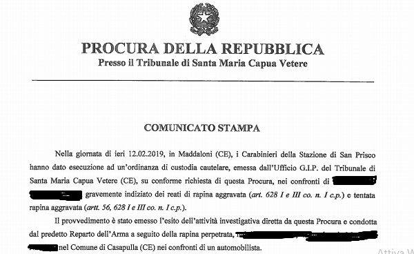 Questo parte del comunicato inviatoci dall'Ufficio della Procura della Repubblica presso il Tribunale di Santa Maria Capua Vetere.