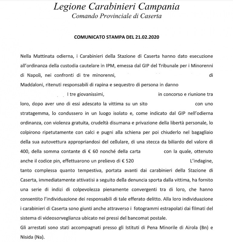 Questo parte del comunicato del Comando Provinciale Carabinieri di Caserta: