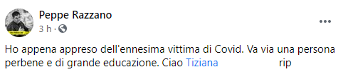 Questo il post pubblicato sulla sua pagina Facebook dal politico di Maddaloni Giuseppe Razzano: "Ho appena appreso dell'ennesima vittima di Covid. Va via - si legge - una persona perbene e di grande educazione. Ciao Tiziana (...) rip".