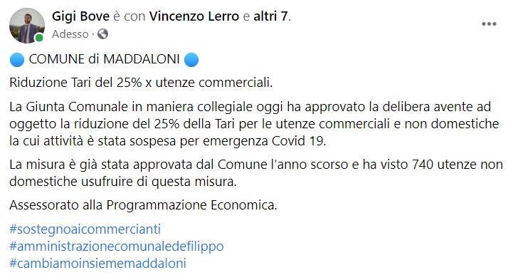 "COMUNE di MADDALONI. Riduzione Tari del 25% per utenze commerciali. La Giunta Comunale in maniera collegiale oggi ha approvato la delibera avente ad oggetto la riduzione del 25% della Tari per le utenze commerciali e non domestiche la cui attività- si legge nella nota- è stata sospesa per emergenza Covid 19. La misura è già stata approvata dal Comune l’anno scorso e ha visto 740 utenze non domestiche usufruire di questa misura. Assessorato alla Programmazione Economica."