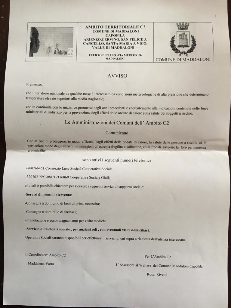 Questo l'avviso ai cittadini del Comune di Maddaloni
