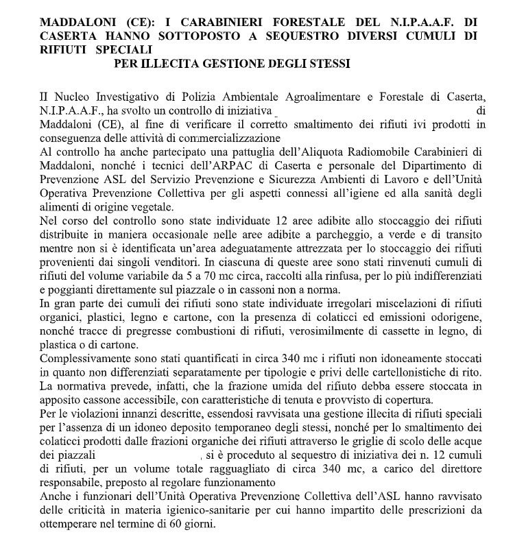 Questo parte della nota stampa del Comando Provinciale Carabinieri di Caserta: