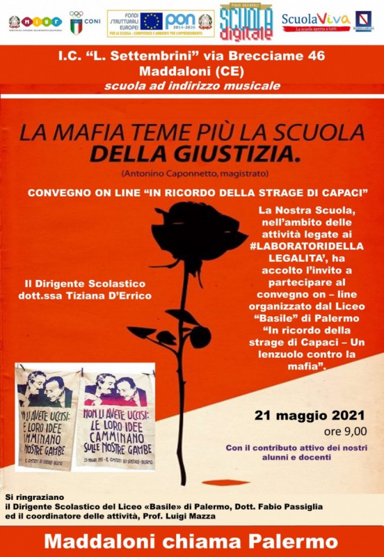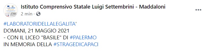 Questo quanto apprendiamo dalla pagina fb dell'Ist. Comprensivo Statale Luigi Settembrini: "LABORATORI DELLA LEGALITA' DOMANI, 21 MAGGIO 2021 - CON IL LICEO "BASILE" DI PALERMO IN MEMORIA DELLA STRAGE DI CAPACI"