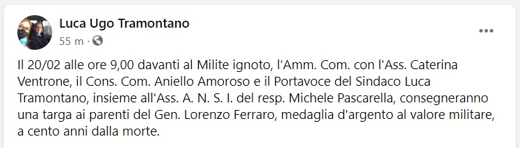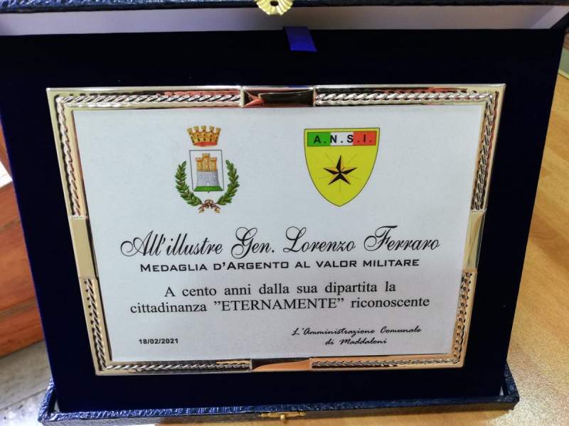 Questo quanto pubblicato sulla pagina fb del Portavoce del Sindaco di Maddaloni: "Il 20/02 alle ore 9,00 davanti al Milite ignoto, l'Amm. Com. con l'Ass. Caterina Ventrone, il Cons. Com. Aniello Amoroso e il Portavoce del Sindaco Luca Tramontano - si legge nella nota -, insieme all'Ass. A.N.S.I. del resp. Michele Pascarella, consegneranno una targa ai parenti del Gen. Lorenzo Ferraro, medaglia d'argento al valore militare, a cento anni dalla morte."