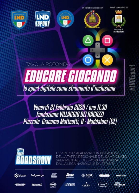 Venerdì 21 alle ore 11.30, presso la Fondazione Villaggio dei Ragazzi di Maddaloni, si terrà la tavola rotonda “Educare giocando, lo sport digitale come strumento d’inclusione”, iniziativa promossa dalla Lega Nazionale Dilettanti in collaborazione con la Fondazione e patrocinata dal Comune di Maddaloni. All'appuntamento interverranno Cosimo Sibilia, presidente della LND, Carmine Zigarelli, presidente del CR Campania, Lucia Fortini, assessore alle politiche sociali della Regione Campania, Felicio De Luca, Commissario Straordinario della Fondazione, Andrea De Filippo, Sindaco di Maddaloni, e don Patrizio Coppola, fondatore dell’Università del videogame (IUDAV). A moderare il convegno sarà il giornalista Lucio Bernardo, referente USSI di Caserta. La tavola rotonda che porrà l’attenzione sulle capacità inclusive degli sport digitali, farà da antipasto al campionato sperimentale di eSport che vedrà Maddaloni come tappa della provincia di Caserta. Infatti, dal pomeriggio di venerdì 21 e fino a quello di sabato 22 si svolgerà la fase eliminatoria del torneo regionale di FIFA 20 su PlayStation 4. I vincitori del challenge campano si qualificheranno per le finali nazionali di Coverciano in programma a fine aprile.