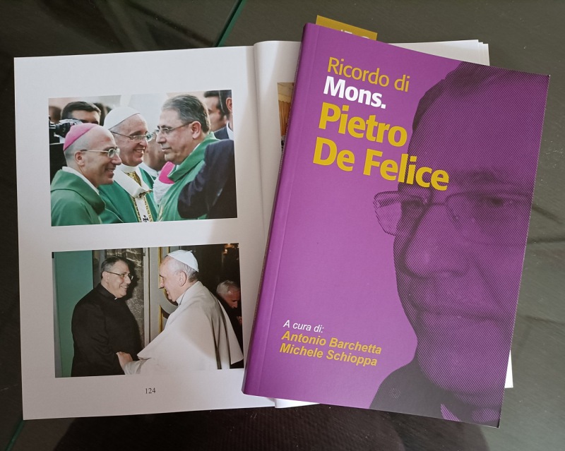 Circa la pubblicazione consegnata ai vescovi, al clero e alla famiglia, va detto che l’elegante pubblicazione a colori, ricchissima di contributi fotografici che riepilogano l’intera vita del protagonista, dal titolo “Ricordo di Mons. Pietro De Felice” (a cura di Antonio Barchetta e Michele Schioppa, edizione Associazione Culturale Musicale Onlus “Aniello Barchetta”, Tipi Depigraf, Caserta 2022) è disponibile a quanti hanno avuto il privilegio di conoscerlo e non solo; è possibile, per coloro i quali lo desiderassero, richiedere una copia della stessa in quelle serate o presso dall’Associazione Culturale Musicale Onlus “Aniello Barchetta” di Maddaloni, a fronte di un contributo simbolico per i costi tipografici