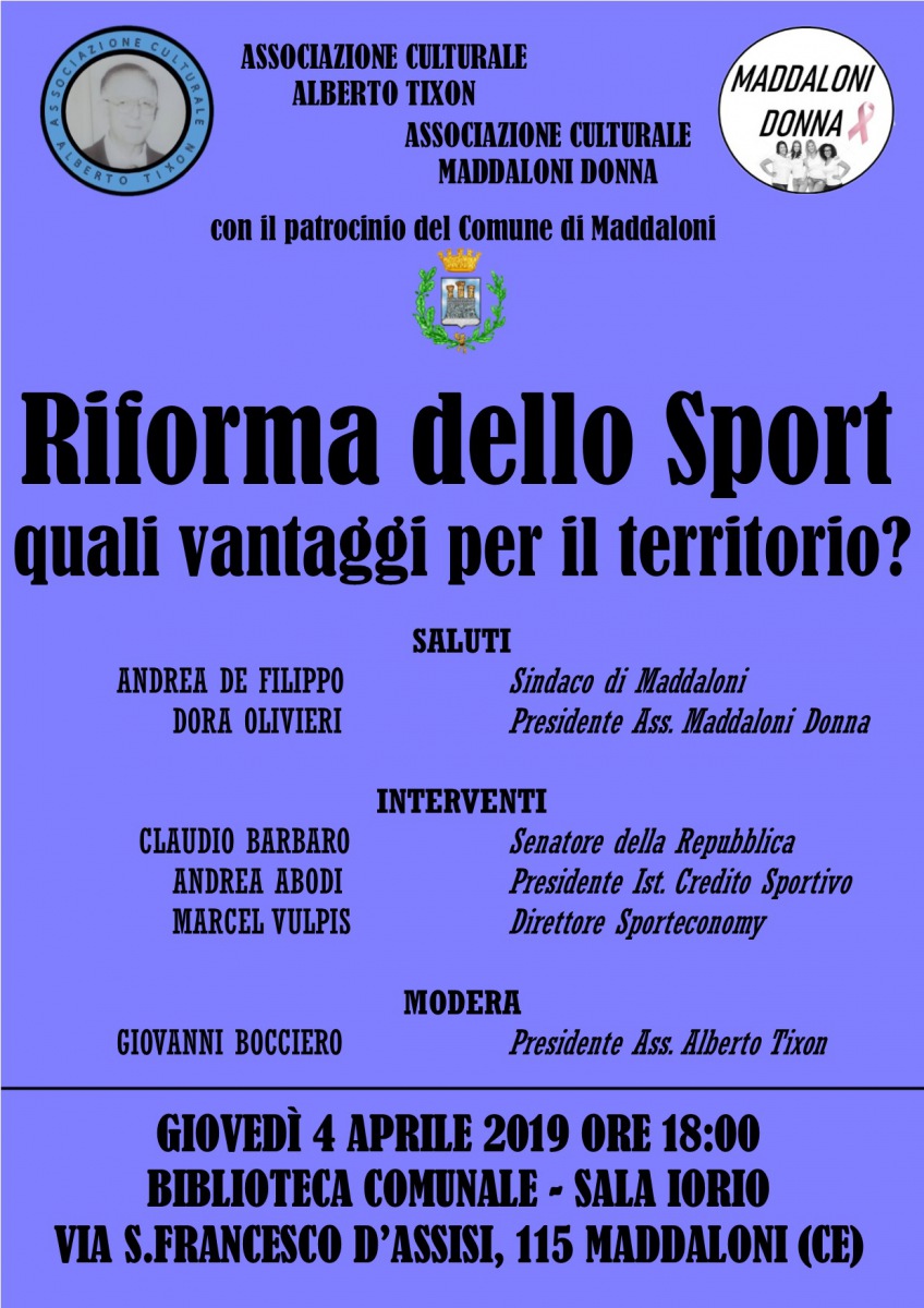 Riceviamo il comunicato stampa arrivato in redazione: "La riforma dello sport introdotta nell'ultima Legge di Bilancio ha cambiato quello che era il vecchio modello del Coni, facendo così assumere un volto nuovo allo sport italiano. È questo il fulcro del convegno "Riforma dello Sport. Quali vantaggi per il territorio?" che si terrà alla Biblioteca comunale di Maddaloni (CE) giovedì 4 aprile con inizio alle ore 18. Organizzato - continua la nota - dalle associazioni culturali Alberto Tixon e Maddaloni Donna, il convegno avrà come relatori il senatore Claudio Barbaro, presentatore del Disegno di legge n. 999 del 21 dicembre 2018 che riguarda la delega al Governo per la razionalizzazione della normativa sullo sport; il presidente dell'Istituto per il Credito Sportivo Andrea Abodi; il direttore dell'agenzia stampa Sporteconomy Marcel Vulpis; oltre ai saluti del sindaco di Maddaloni Andrea De Filippo e del presidente di Maddaloni Donna Dora Olivieri. Farà da moderatore dell'incontro il giornalista e presidente dell'associazione Alberto Tixon Giovanni Bocciero. Tanti i temi che saranno snocciolati - continua la nota - a proposito della riforma che punta ad avere uno sport non solo votato all'alto livello - e dunque professionistico - ma anche a quello di base, che è il vero motore di tutto il movimento sportivo italiano. Uno sport che sia salutare, inclusivo, educativo e non solo competitivo, ma soprattutto che ritorni ad essere praticato a scuola. La nascente Sport e Salute spa che andrà a sostituire il Coni nell'attività amministrativa dello sport; la detrazione fiscale per gli over 60 nell'attività motoria; la programmazione periodica di visite mediche sportive gratuite a scuola; la creazione di una federazione degli sport scolastici. Temi che riguarderanno anche i Ministeri della Salute e della Pubblica Istruzione, proprio perché lo sport dovrà avere tutta un'altra interpretazione. E questo comporterà, inevitabilmente, una ricaduta anche sul territorio locale. Al termine - continua la nota - degli interventi ci sarà un dibattito con la possibilità di fare domande. Tutti sono invitati a partecipare, in particolare le società sportive e gli operatori del mondo dello sport con varie funzioni.