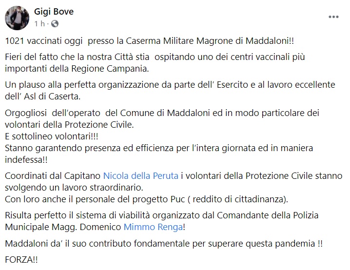 Questo quanto apprendiamo dalla pagina fb del Vice Sindaco di Maddaloni: "1021 vaccinati oggi presso la Caserma Militare Magrone di Maddaloni!! Fieri del fatto che la nostra Città stia ospitando uno dei centri vaccinali più importanti della Regione Campania. Un plauso alla perfetta organizzazione - si legge nella nota - da parte dell’Esercito e al lavoro eccellente dell’Asl di Caserta. Orgogliosi dell’operato del Comune di Maddaloni ed in modo particolare dei volontari della Protezione Civile. E sottolineo volontari!!! Stanno garantendo presenza ed efficienza per l’intera giornata ed in maniera indefessa!! Coordinati dal Capitano Nicola della Peruta i volontari della Protezione Civile stanno svolgendo un lavoro straordinario. Con loro - si legge nella nota - anche il personale del progetto Puc (reddito di cittadinanza). Risulta perfetto il sistema di viabilità organizzato dal Comandante della Polizia Municipale Magg. Domenico Mimmo Renga! Maddaloni da’ il suo contributo fondamentale per superare questa pandemia!! FORZA!!"