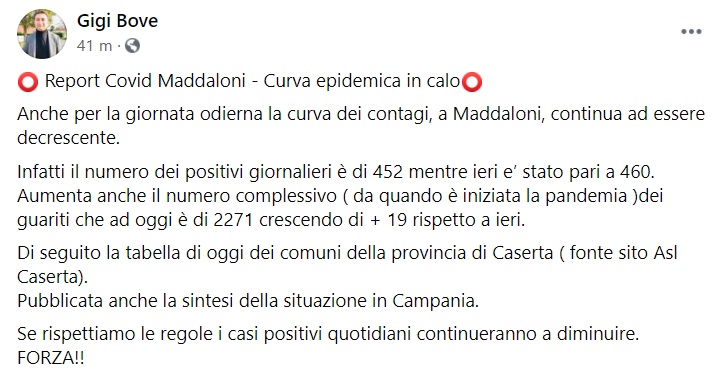 Questo quanto pubblicato sulla pagina fb del Vicesindaco di Maddaloni: "Report Covid Maddaloni - Curva epidemica in calo Anche per la giornata odierna la curva dei contagi, a Maddaloni, continua ad essere decrescente. Infatti - si legge nella nota - il numero dei positivi giornalieri è di 452 mentre ieri e’ stato pari a 460. Aumenta anche il numero complessivo (da quando è iniziata la pandemia) dei guariti che ad oggi è di 2271 crescendo di + 19 rispetto a ieri. Di seguito la tabella di oggi dei comuni della provincia di Caserta (fonte sito Asl Caserta). Pubblicata anche la sintesi della situazione in Campania. Se rispettiamo le regole i casi positivi quotidiani - si legge nella nota - continueranno a diminuire. FORZA!!"