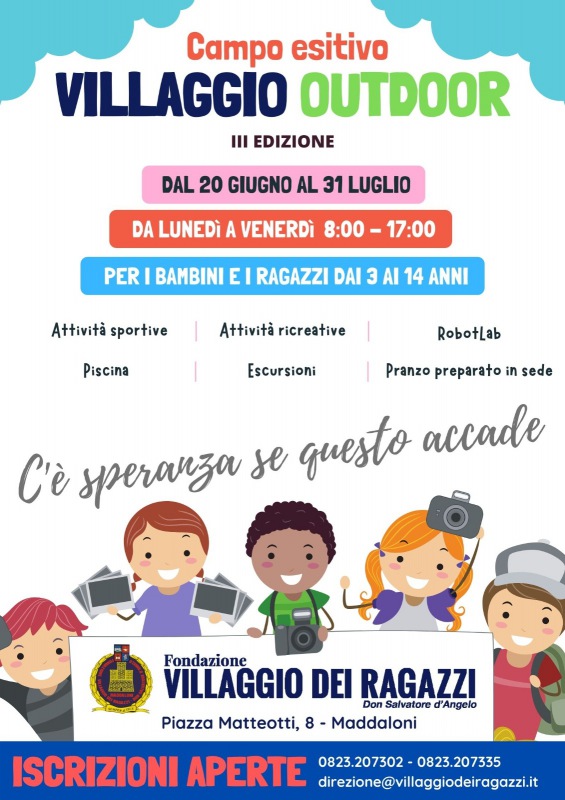 Questo il comunicato stampa diffuso dal Villaggio dei Ragazzi di Maddaloni: "Dopo le positive esperienze degli ultimi anni, arriva, a grande richiesta, la III° edizione di “VillaggioOUTdoor “C’è speranza se questo accade”, il campo estivo per bambini/e e ragazzi/e di età compresa tra i 3 e i 14 anni organizzato dalla Fondazione Villaggio dei Ragazzi “don Salvatore d’Angelo”. L’edizione 2022 del Campo, che nel pieno rispetto della normativa anti Covid 19 - si legge nel comunicato - si svolgerà all’interno della struttura della Fondazione dal 20 giugno al 31 luglio (dal Lunedì al Venerdì, dalle 8.00 alle 17.00), offrirà ai ragazzi nel periodo dell'anno dedicato al riposo per la sospensione di tutti gli impegni scolastici un tempo certamente di svago ma di natura "costruttiva". Il tempo d’estate che i ragazzi trascorreranno al “Villaggio”, quindi,