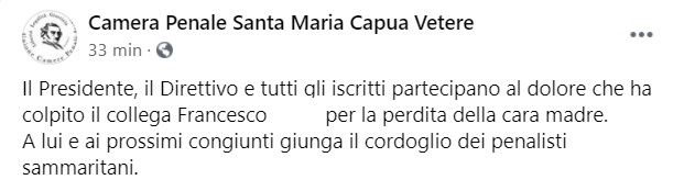 "Il Presidente, il Direttivo e tutti gli iscritti partecipano al dolore che ha colpito il collega Francesco ... per la perdita della cara madre. -Si legge nella nota- A lui e ai prossimi congiunti giunga il cordoglio dei penalisti sammaritani."