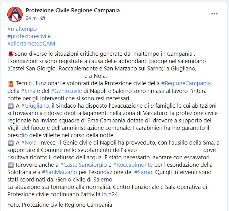 Questo quanto apprendiamo dalla pagina fb della Prot. Civile Campania: "Sono diverse le situazioni critiche generate dal maltempo in Campania. Esondazioni si sono registrate a causa delle abbondanti piogge nel salernitano (Castel San Giorgio, Roccapiemonte e San Marzano sul Sarno); a Giugliano, ... e a Nola. Tecnici, funzionari e volontari della Protezione civile - si legge nella nota - della Regione Campania, della Sma e del Genio Civile di Napoli e Salerno sono rimasti al lavoro l’intera notte per gli interventi che si sono resi necessari. A Giugliano, il Sindaco ha disposto l’evacuazione di 9 famiglie le cui abitazioni si trovavano a ridosso degli allagamenti nella zona di Varcaturo: la protezione civile regionale ha inviato squadre di Sma Campania dotate di idrovore a supporto dei Vigili del fuoco e dell’amministrazione comunale. I carabinieri - si legge nella nota - hanno garantito il presidio delle villette nel corso della notte. A Nola, invece, il Genio civile di Napoli ha provveduto, con l’ausilio della Sma, a supportare il Comune nello svuotamento dell’alveo ... dove risultava ridotto il deflusso dell’acqua. È stato necessario lavorare con escavatori. Idrovore anche a Castel San Giorgio e Roccapimonte per l’esondazione della Solofrana e a San Marzano per l’esondazione del Sarno. Qui gli interventi sono stati coordinati dal Genio civile di Salerno. La situazione sta tornando alla normalità - si legge nella nota -. Centro Funzionale e Sala operativa di Protezione civile continuano l’attività in h24. Foto: Protezione civile Regione Campania"