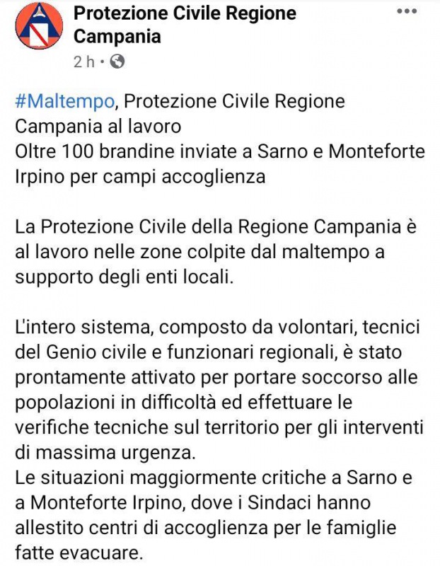 Questo quanto pubblicato dalla Prot. Civile Campania