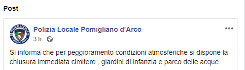 "Si informa che per peggioramento condizioni atmosferiche si dispone la chiusura immediata cimitero , giardini di infanzia e parco delle acque"