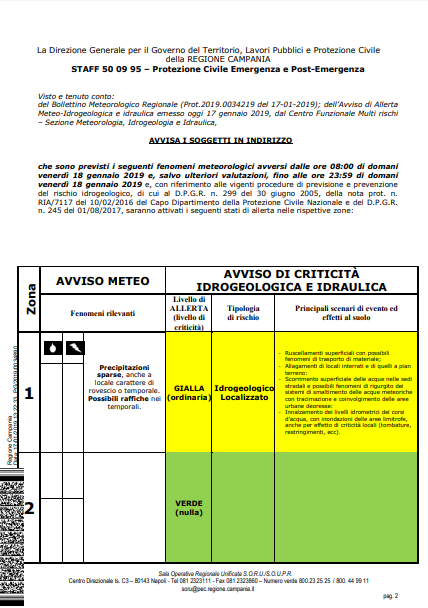 "che sono previsti i seguenti fenomeni meteorologici avversi dalle ore 08:00 di domani venerdì 18 gennaio 2019 e, salvo ulteriori valutazioni, fino alle ore 23:59 di domani venerdì 18 gennaio 2019 e, con riferimento alle vigenti procedure di previsione e prevenzione del rischio idrogeologico, di cui al D.P.G.R. n. 299 del 30 giugno 2005, della nota prot. n. RIA/7117 del 10/02/2016 del Capo Dipartimento della Protezione Civile Nazionale e del D.P.G.R. n. 245 del 01/08/2017, saranno attivati i seguenti stati di allerta nelle rispettive zone: