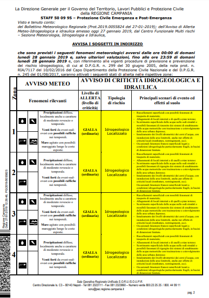 "AVVISA I SOGGETTI IN INDIRIZZO che sono previsti i seguenti fenomeni meteorologici avversi dalle ore 00:00 di domani lunedì 28 gennaio 2019 e, salvo ulteriori valutazioni, fino alle ore 23:59 di domani lunedì 28 gennaio 2019 e, con riferimento alle vigenti procedure di previsione e prevenzione del rischio idrogeologico, di cui al D.P.G.R. n. 299 del 30 giugno 2005, della nota prot. n. RIA/7117 del 10/02/2016 del Capo Dipartimento della Protezione Civile Nazionale e del D.P.G.R. n. 245 del 01/08/2017, saranno attivati i seguenti stati di allerta nelle rispettive zone:..."