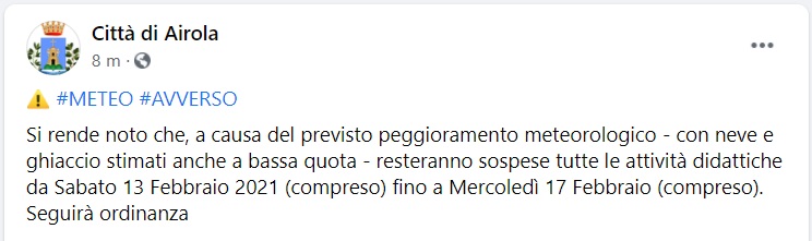 Questo quanto apprendiamo dalla pagina facebook del Comune di Airola: "Si rende noto che, a causa del previsto peggioramento meteorologico - con neve e ghiaccio stimati anche a bassa quota - si legge nella nota - resteranno sospese tutte le attività didattiche da Sabato 13 Febbraio 2021 (compreso) fino a Mercoledì 17 Febbraio (compreso). Seguirà ordinanza"