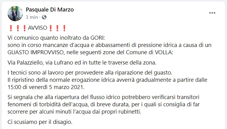 Questo quanto apprendiamo dalla pagina fb del Sindaco di Volla: "AVVISO Vi comunico quanto inoltrato da GORI: sono in corso mancanze d'acqua e abbassamenti di pressione idrica a causa di un GUASTO IMPROVVISO - si legge nella nota -, nelle seguenti zone del Comune di VOLLA: Via Palazziello, via Lufrano ed in tutte le traverse della zona. I tecnici sono al lavoro per provvedere alla riparazione del guasto. Il ripristino della normale erogazione idrica avverrà gradualmente a partire dalle 15:00 di venerdì 5 marzo 2021. Si segnala che alla riapertura del flusso idrico potrebbero verificarsi transitori fenomeni di torbidità dell'acqua, di breve durata - si legge nella nota -, per i quali si consiglia di far scorrere per alcuni minuti l'acqua dai propri rubinetti. Ci scusiamo per il disagio."
