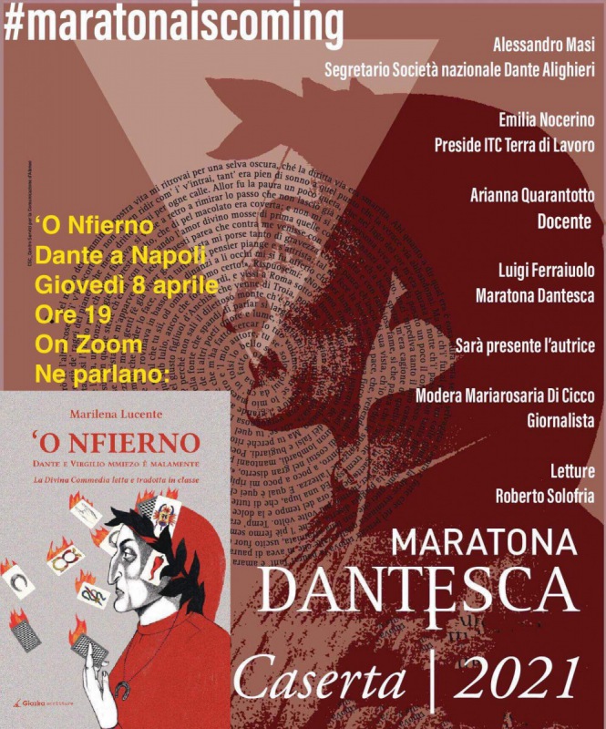 Pubblichiamo questo Comunicato Stampa: "In letteratura non sarebbe azzardato sostenere che tutte le strade portano a Dante. Forse non solo in letteratura. E’ questo il motivo per cui l’amore verso il sommo Poeta - si legge nella nota - non tramonta mai. Non solo nel nostro Paese ma in tutto il mondo. Nel settecentesimo della morte - celebrata con forza dal ministero della Cultura - parte a Caserta #maratonaiscoming, un'iniziativa della #MaratonaDantesca, la versione digitale, che intende accompagnarci durante tutto l’anno Dantesco e in attesa della Maratona vera e propria, che si preannuncia un grande evento nazionale, come accade con quella del 2016. Cominciamo con un libro di Marilena Lucente, docente di scuola superiore con una intensa attività da scrittrice - si legge nella nota -, «’O Nfierno», che ci racconta Dante spiegato, sminuzzato, triturato e digerito per i ragazzi della generazione play station. Una bella scoperta, che punta ad attualizzare, come piace anche a noi, il nostro «Messer Durante». L’appuntamento è per domani, alle 19, on line, su zoom e in streaming sulla pagina facebook della Maratona Dantesca: fb/maratonadantesca, con la partecipazione di Alessandro Masi, segretario nazionale della Società Dante Alighieri; Emilia Nocerino, preside dell’Itc Terra di Lavoro; Arianna Quarantotto, docente; Luigi Ferraiuolo, della «Maratona Dantesca»; e ovviamente - si legge nella nota - l’autrice, Marilena Lucente, Modera la giornalista Mariarosaria Di Cicco. leggerà passi del libro e di Dante il bravissimo attore Roberto Solofria, appena visto anche nella serie televisiva «Il Commissario Ricciardi». Per sostenere l’iniziativa e rimanere informati, consultate la pagina facebook/maratonadantesca."