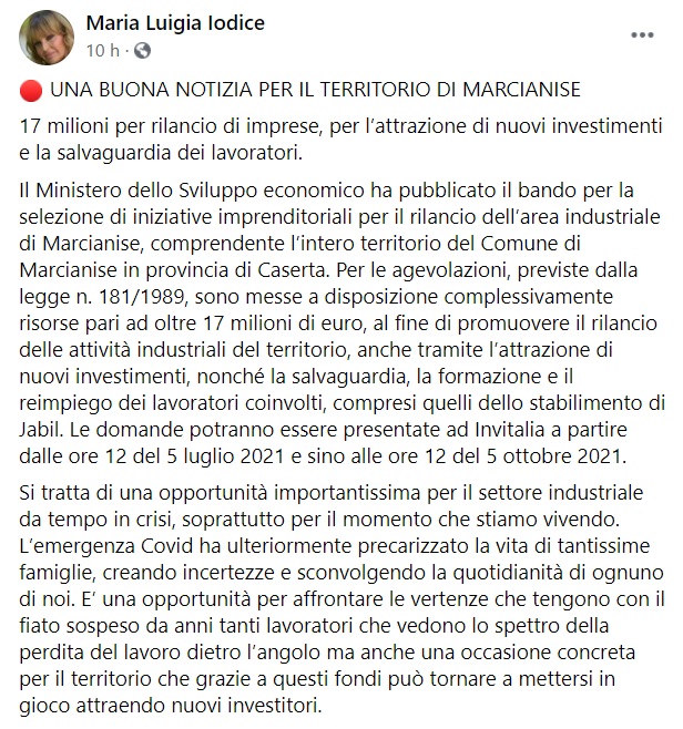 Questo quanto apprendiamo dalla pagina fb del Consigliere regionale Maria Luigia Iodice: "UNA BUONA NOTIZIA PER IL TERRITORIO DI MARCIANISE 17 milioni per rilancio di imprese, per l’attrazione di nuovi investimenti e la salvaguardia dei lavoratori.