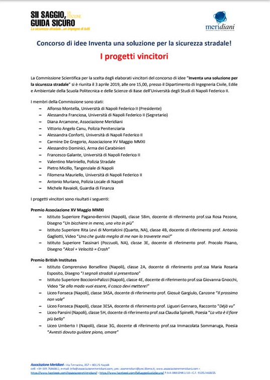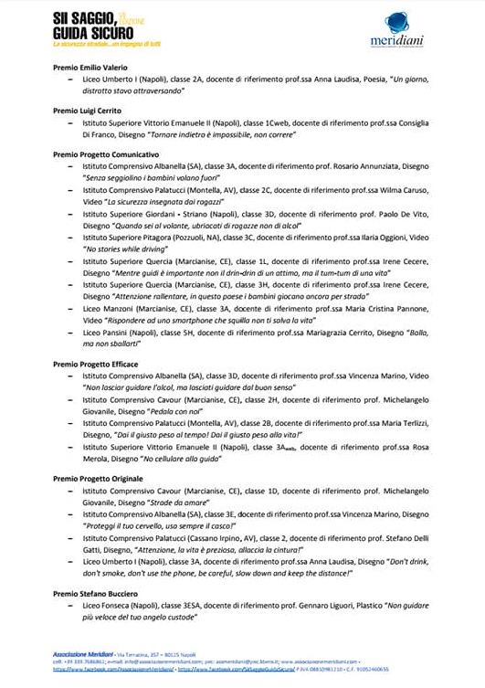 "Complimenti vivissimi agli studenti delle classi 1D, 2H dell'Istituto Comprensivo Cavour e delle classi 1L e 3H dell' Isituto Superiore Quercia che sono risultati vincitori del concorso di idee "inventa una soluzione per la sicurezza stradale. Al concorso regionale, promosso dalla Associazione Meridiani di Napoli, hanno partecipato numerose scuole di tutta la Regione Campania. Complimenti, altresì, ai docenti di riferimento prof.ssa Irene Cecere e prof. Michelangelo Giovanile, nonché ai Dirigenti degli istituti Aldo Improta e Diamante Marotta! Ad maiora!"