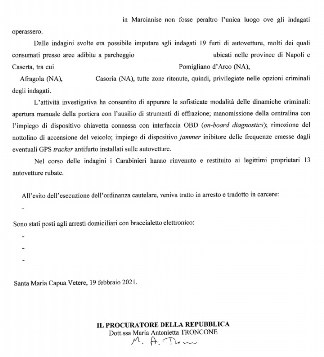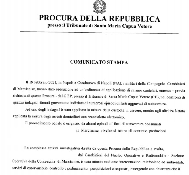Pubblichiamo nota stampa della Procura di SMCV