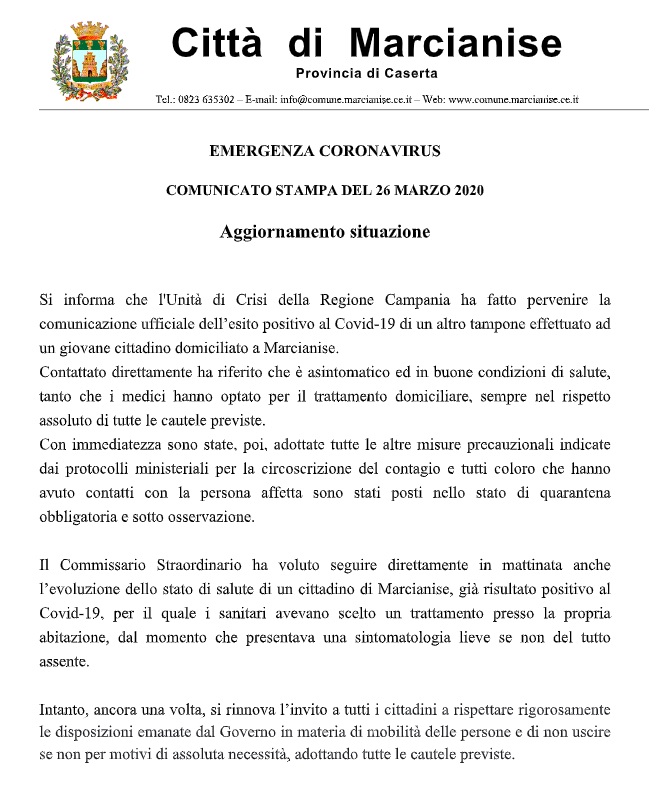 Pubblichiamo nota stampa del Comune di Marcianise