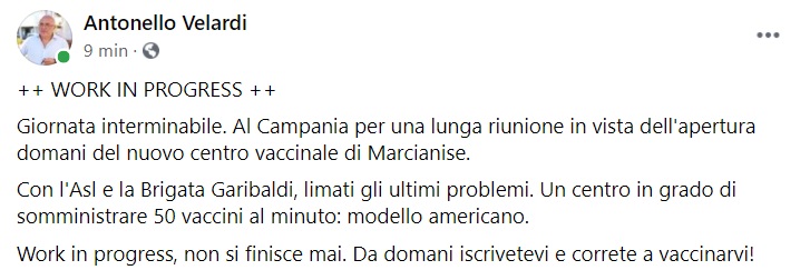 "Giornata interminabile. Al Campania per una lunga riunione in vista dell'apertura domani del nuovo centro vaccinale di Marcianise. -Si legge nella nota- Con l'Asl e la Brigata Garibaldi, limati gli ultimi problemi. Un centro in grado di somministrare 50 vaccini al minuto: modello americano. Work in progress, non si finisce mai. Da domani iscrivetevi e correte a vaccinarvi!"