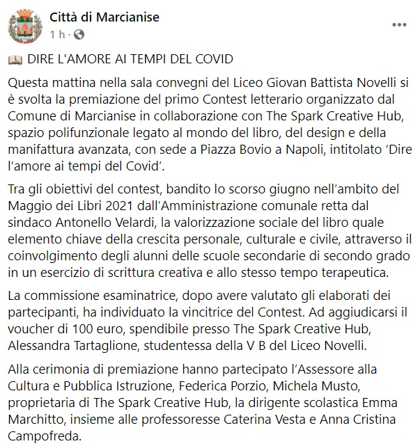 "DIRE L'AMORE AI TEMPI DEL COVID. Questa mattina nella sala convegni del Liceo Giovan Battista Novelli si è svolta la premiazione del primo Contest letterario organizzato dal Comune di Marcianise in collaborazione con The Spark Creative Hub, spazio polifunzionale legato- si legge nella nota- al mondo del libro, del design e della manifattura avanzata, con sede a Piazza Bovio a Napoli, intitolato ‘Dire l’amore ai tempi del Covid’. Tra gli obiettivi del contest, bandito lo scorso giugno nell’ambito del Maggio dei Libri 2021 dall’Amministrazione comunale retta dal sindaco Antonello Velardi, la valorizzazione sociale del libro quale elemento chiave della crescita personale, culturale e civile, attraverso il coinvolgimento degli alunni delle scuole secondarie di secondo grado in un esercizio di scrittura creativa e allo stesso tempo terapeutica. La commissione esaminatrice, dopo avere valutato gli elaborati dei partecipanti, ha individuato la vincitrice del Contest. Ad aggiudicarsi il voucher di 100 euro, spendibile presso The Spark Creative Hub, Alessandra Tartaglione, studentessa della V B del Liceo Novelli. Alla cerimonia di premiazione hanno partecipato- si legge nella nota- l’Assessore alla Cultura e Pubblica Istruzione, Federica Porzio, Michela Musto, proprietaria di The Spark Creative Hub, la dirigente scolastica Emma Marchitto, insieme alle professoresse Caterina Vesta e Anna Cristina Campofreda."