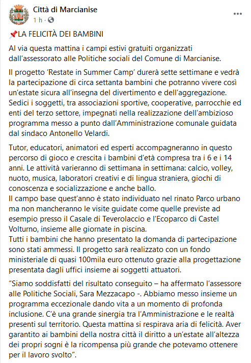 Questo il post pubblicato sulla pagina Facebook Città di Marcianise: "Al via questa mattina i campi estivi gratuiti organizzati dall’assessorato alle Politiche sociali del Comune di Marcianise.Il progetto ‘Restate in Summer Camp’ durerà sette settimane e vedrà la partecipazione di circa settanta bambini che potranno vivere così un’estate sicura all’insegna del divertimento e dell’aggregazione. Sedici i soggetti, tra associazioni sportive, cooperative, parrocchie ed enti del terzo settore, impegnati nella realizzazione dell’ambizioso programma messo a punto dall’Amministrazione comunale guidata dal sindaco Antonello Velardi. Tutor, educatori, animatori ed esperti accompagneranno - si legge nel post - in questo percorso di gioco e crescita i bambini d’età compresa tra i 6 e i 14 anni. Le attività varieranno di settimana in settimana: calcio, volley, nuoto, musica, laboratori creativi e di lingua straniera, giochi di conoscenza e socializzazione e anche ballo. Il campo base - continua il post - quest’anno è stato individuato nel rinato Parco urbano ma non mancheranno le visite guidate come quelle previste ad esempio presso il Casale di Teverolaccio e l’Ecoparco di Castel Volturno, insieme alle giornate in piscina. Tutti i bambini che hanno presentato la domanda di partecipazione sono stati ammessi. Il progetto - prosegue -sarà realizzato con un fondo ministeriale di quasi 100mila euro ottenuto grazie alla progettazione presentata dagli uffici insieme ai soggetti attuatori. “Siamo soddisfatti del risultato conseguito – ha affermato l’assessore alle Politiche Sociali, Sara Mezzacapo -. Abbiamo messo insieme un programma eccezionale dando vita a un momento di profonda inclusione. C’è una grande sinergia tra l’Amministrazione e le realtà presenti sul territorio. Questa mattina - chiosa - si respirava aria di felicità. Aver garantito ai bambini della nostra città il diritto a un’estate all’altezza dei propri sogni è la ricompensa più grande che potevamo ottenere per il lavoro svolto”.