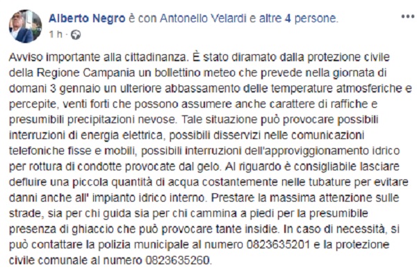 Questo il post pubblicato da Alberto Negro, dirigente della Polizia Municipale di Marcianise.