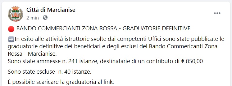 Questo quanto pubblicato sulla pagina fb Città di Marcianise: "BANDO COMMERCIANTI ZONA ROSSA - GRADUATORIE DEFINITIVE In esito alle attività istruttorie svolte dai competenti Uffici - si legge nella nota - sono state pubblicate le graduatorie definitive dei beneficiari e degli esclusi del Bando Commericanti Zona Rossa - Marcianise. Sono state ammesse n. 241 istanze, destinatarie di un contributo di € 850,00 Sono state escluse n. 40 istanze - si legge nella nota -. È possibile scaricare la graduatoria al link CLICCA QUI".