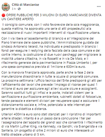Questo il post pubblicato sulla pagina Facebook 'Città di Marcianise: "OPERE PUBBLICHE PER 3 MILIONI DI EURO: MARCIANISE DIVENTA UN CANTIERE APERTO. Il consiglio comunale, con il voto favorevole della sola maggioranza, questa mattina, ha approvato una serie di atti propedeutici alla realizzazione di nuovi importanti interventi di riqualificazione urbana. Con il via libera - si legge - all’assestamento di bilancio e all’integrazione del Piano triennale delle opere pubbliche, l’Amministrazione guidata dal sindaco Antonello Velardi, ha individuato e predisposto in bilancio i fondi per eseguire il restyling della facciata della casa comunale e del cortile interno, la costruzione di due nuovi parcheggi - prosegue il post - per migliorare la mobilità urbana cittadina, in via Rossetti e in via De Maio, e il rifacimento generale della pavimentazione in Piazza Umberto I, per una spesa complessiva prevista di 1milione e 600mila euro. Con la manovra finanziaria approvata, parte anche la fase 2 della manutenzione straordinaria in tutte le scuole di proprietà comunale. La prossima settimana l’ufficio tecnico dell’Ente predisporrà gli atti per l’affidamento dei lavori che prevede l’impiego di risorse per quasi 1 milione di euro per assicurare agli allievi scuole sicure e accoglienti. Saranno sostituti - si legge ancora - tutti gli infissi e le porte, installati sistemi per la sanificazione e purificazione ambientale, rubinetti dotati di fotocellule, tende parasole e elementi divisori per recuperare spazi e assicurare il distanziamento sociale e, infine, potenziata la rete internet per garantire la didattica a distanza. Ulteriori 400mila euro sono stati stanziati per il ripristino di importanti arterie stradali. Intanto - prosegue il post - è a un passo dalla conclusione l’iter per l’assegnazione dell’appalto dei grandi assi che consentirà il rifacimento di via Martin Luther King, via Kennedy, via Gandhi, via Evangelista e via Santella. Un progetto di oltre 2 milioni di euro che interesserà un tratto stradale urbano di 5 km".