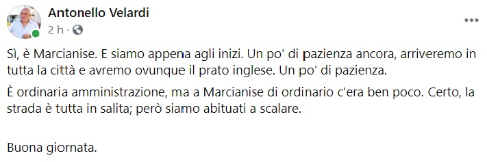 Questo quanto apprendiamo dalla pagona fb del Sindaco Velardi: "Sì, è Marcianise. E siamo appena agli inizi. Un po' di pazienza ancora, arriveremo in tutta la città e avremo ovunque il prato inglese. Un po' di pazienza - si legge nella nota -. È ordinaria amministrazione, ma a Marcianise di ordinario c'era ben poco. Certo, la strada è tutta in salita; però siamo abituati a scalare. ... Buona giornata."